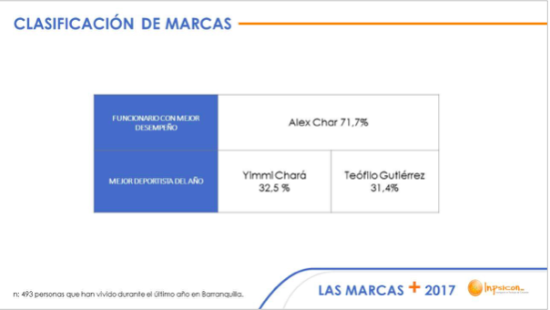 Con un porcentaje de favorabilidad del 71,1%, el funcionario público con Mejor Desempeño es el actual alcalde de Barranquilla Alejandro Char, quien fue escogido como el Mejor Alcalde del país en el 2017, según la última encuesta Pulso País Colombia y Gallup entre otras. La aprobación longitudinal de su gestión durante todo su período como funcionario público se valida con los resultados de la encuesta anual “Barranquilla Cómo Vamos”, en la que destacan su desempeño como dirigente, el 88% de los barranquilleros, se siente satisfecho con la ciudad y el 87%, se siente orgulloso.